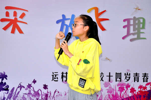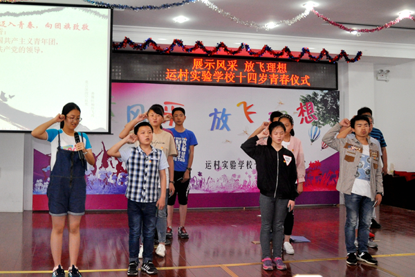 运村实验学校举行“十四岁青春仪式” 5月27日下午班会课,我校部分校领导、八年级全体师生及八年级部分家长齐聚综合楼四楼报告厅,举行了“展示风采,放飞理想”十四岁青春仪式。 首先同学们排着整齐的队伍,踏进了“青春之门”,然后用唱队歌的形式,向少年生活告别。 本次活动共分三个篇章。第一篇章:才艺展示,现青春风采,这一篇章是最能体现学生青春朝气的,三个班的学生为大家上演了精彩的节目,节目的形式丰富多样,有配乐朗诵《青春之歌》、歌曲《我的天空》、小品《给咖啡加点糖》等6个节目,男孩女孩们利用课余时间排练的节目充满青春气息,赢得了全场一次又一次的掌声!第二篇章:迈入青春,向团旗致敬,这一篇章主要是由团总支书记宣布新团员名单,班主任为老团员帮新团员戴团徽和新团员代表讲话。第三篇章:师长祝福,青春誓言,为理想加油,在这个篇章,家长代表王麒妈妈发表了发自内心的讲话,她回忆了孩子成长的过程,阐释了“青春的含义”希望孩子们能做诚实、善良、有志向、有担当的人。随后,学校巢拥军副校长为本次活动致辞,他首先代表学校在同学们十四岁到来之际送上最美好的祝福;其次,巢校长围绕“2017撸起袖子加油干”这句话对同学们提出了要求和希望。最后,全体学生以青春的名义宣誓。 本次青春仪式活动,同学们感悟了成长的力量,明确了青春的责任,我们祝福同学们在人生中最激情的时光里,在人生快乐奔放的华丽舞台上演绎人生的精彩。