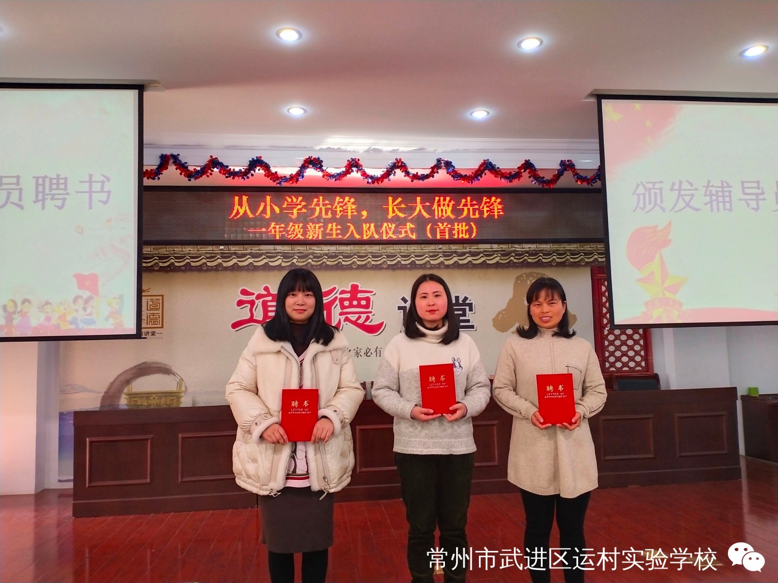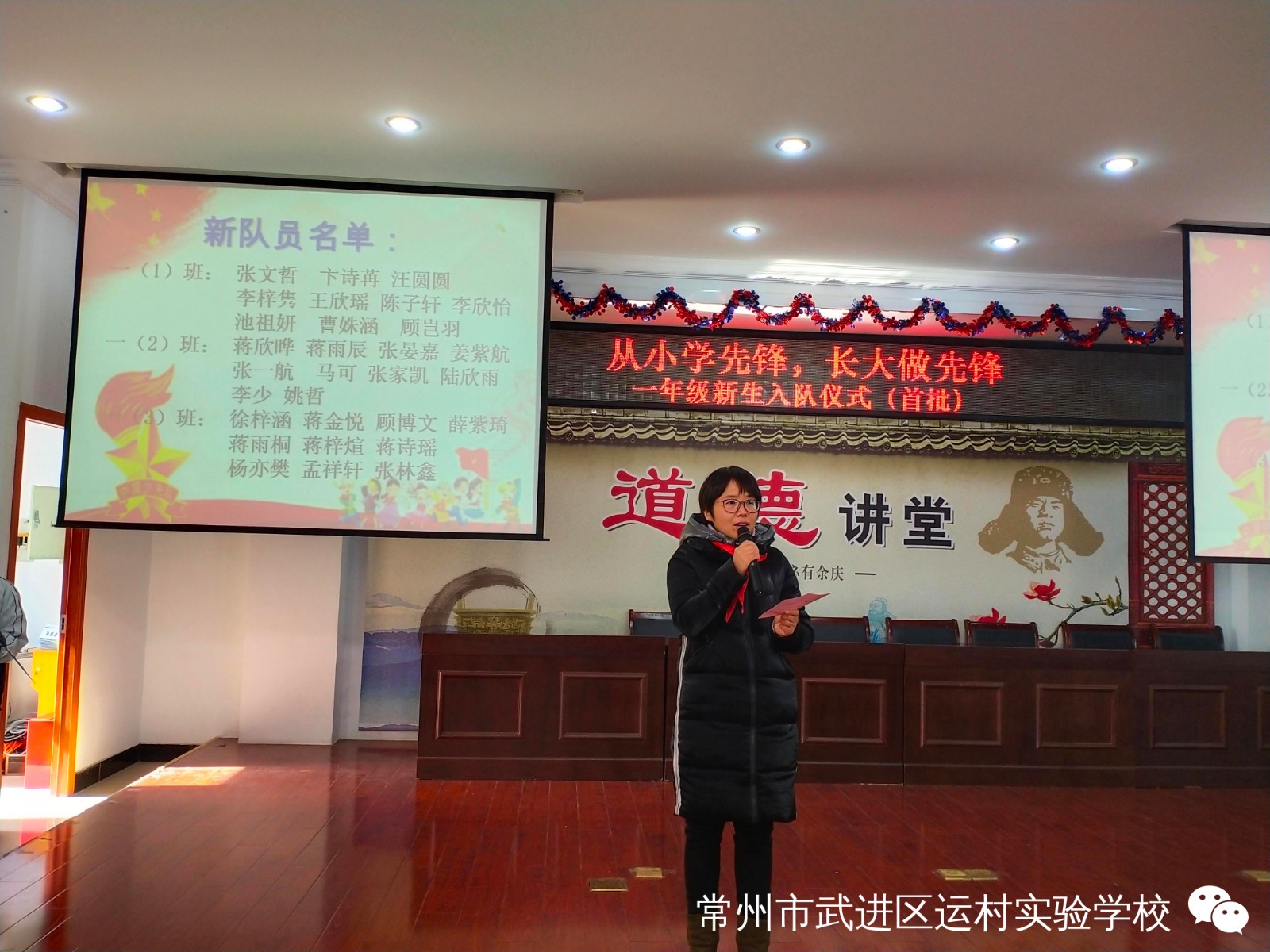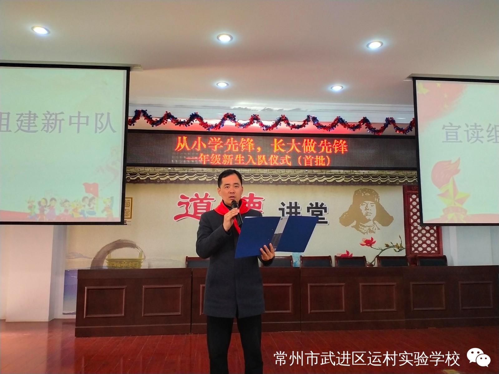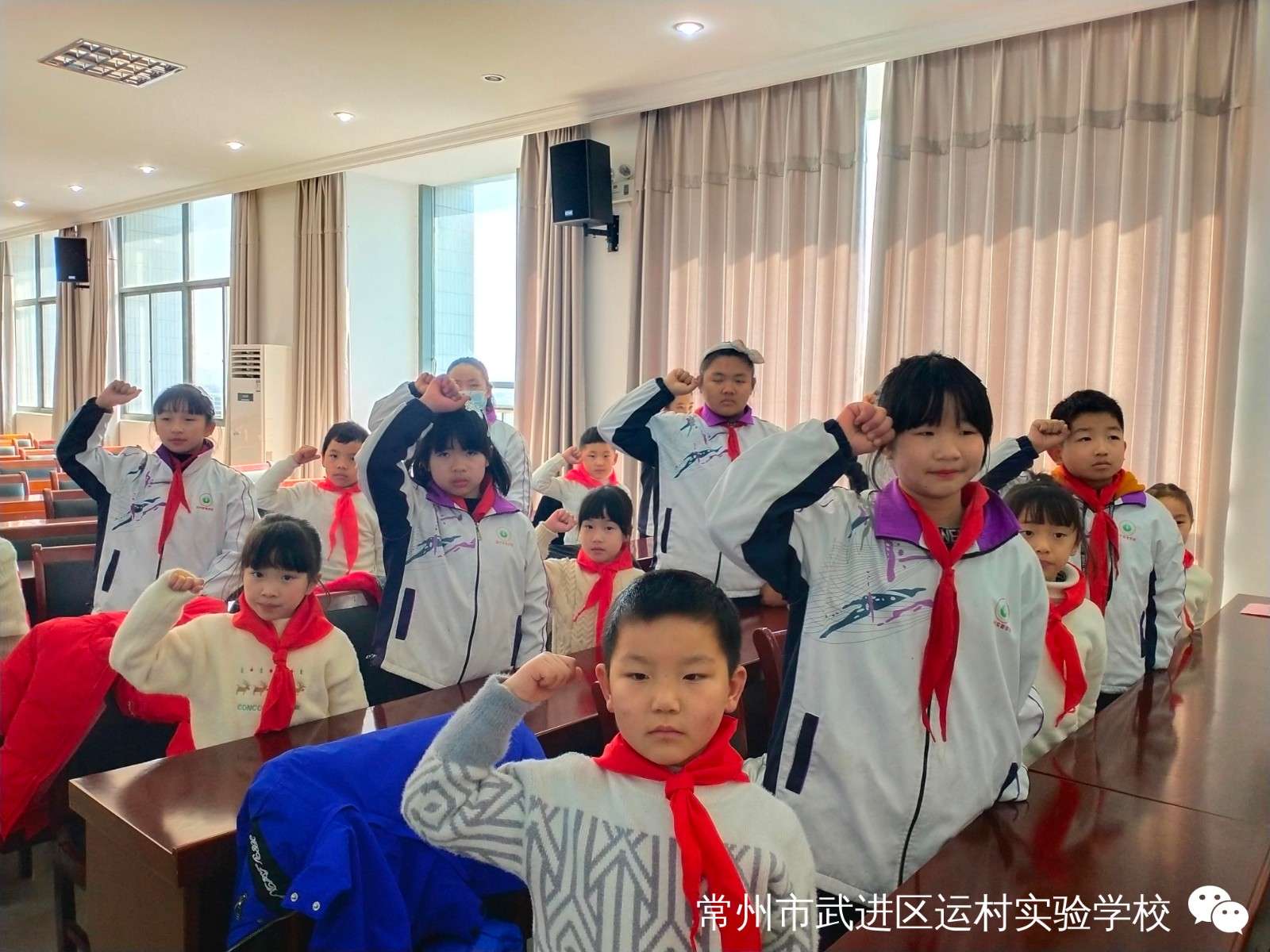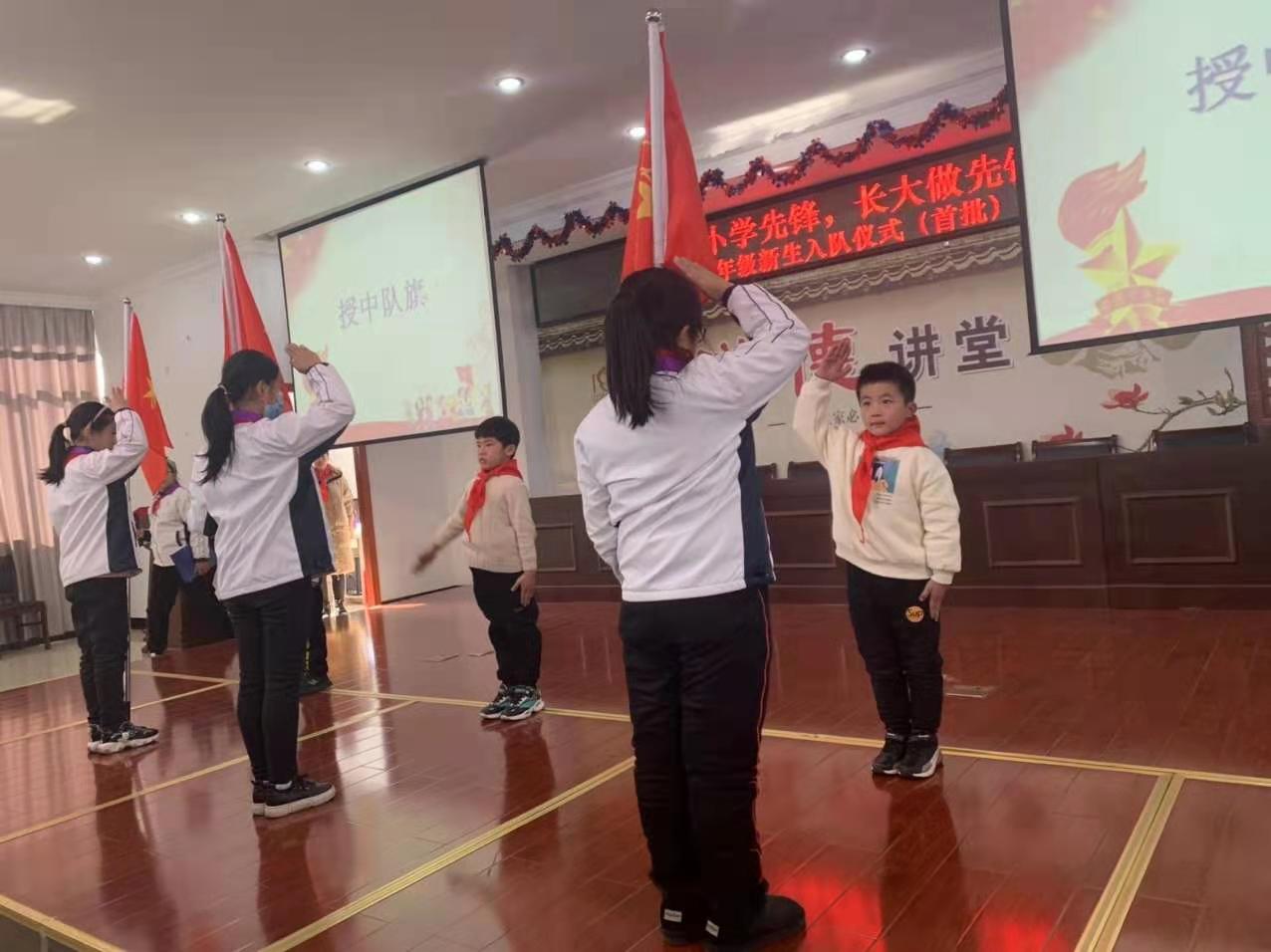 “从小学先锋,长大做先锋”新队员分批入队仪式 为规范入队程序,逐渐改变“全童同时入队”的方式,有组织、分批次地吸收适龄少年儿童加入少先队,构建少先队员阶梯式成长激励体系,培养我校少先队员的光荣感和组织归属感,12月30日,我校举行了“从小学先锋,长大做先锋”新队员分批入队仪式。 活动前,一年级的辅导员响应大队部的号召,开展了入队前的教育活动。新队员提交了入队申请书。 伴随着节奏鲜明、庄严肃穆的出旗曲,少先队升旗手与护旗手们迈着整齐的步伐,雄赳赳、气昂昂地走了过来,拉开了新生入队仪式的帷幕。 队员们齐声高唱《中国少年先锋队队歌》,洪亮的歌声表达了对少先队组织的热爱。 董校长宣读了“组建新中队”决定,校领导为三位辅导员颁发聘书。薛亚萍主任宣读了新队员名单。 马克等30位同学首批加入中队少年先锋队,成为了一名光荣的少先队员。 老队员为新队员佩戴鲜艳的红领巾,看着胸前鲜艳的红领巾,队员们感到无比自豪和骄傲。 接下来,学校大队委为一年级各中队授上中队旗。 大队长徐琳涵带领新队员宣誓。稚气、铿锵的话语,表达了成为一名光荣少先队的自豪心情,也表达了他们努力为红领巾增添光彩的决心。 六(3)中队的王周苗作为老队员发言,给新队员提出了希望。一(2)中队 ,代表全体新队员发言,决心好好学习,争做新时代好队员。 大队辅导员恽瑶老师向新队员表示热烈的祝贺,并向新队员提出新的希望和要求,勉励全体少先队员好好学习、好好锻炼、在少先队组织中历练,为胸前的红领巾增添光彩。 入队仪式在新队员的才艺表演中圆满结束,30名新队员在全体师生的见证下接受了一次庄重、神圣的洗礼,愿队员们在星星火炬队旗的指引下,热爱祖国,热爱学习,不负光荣使命,做优秀的共产主义接班人。