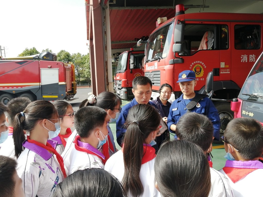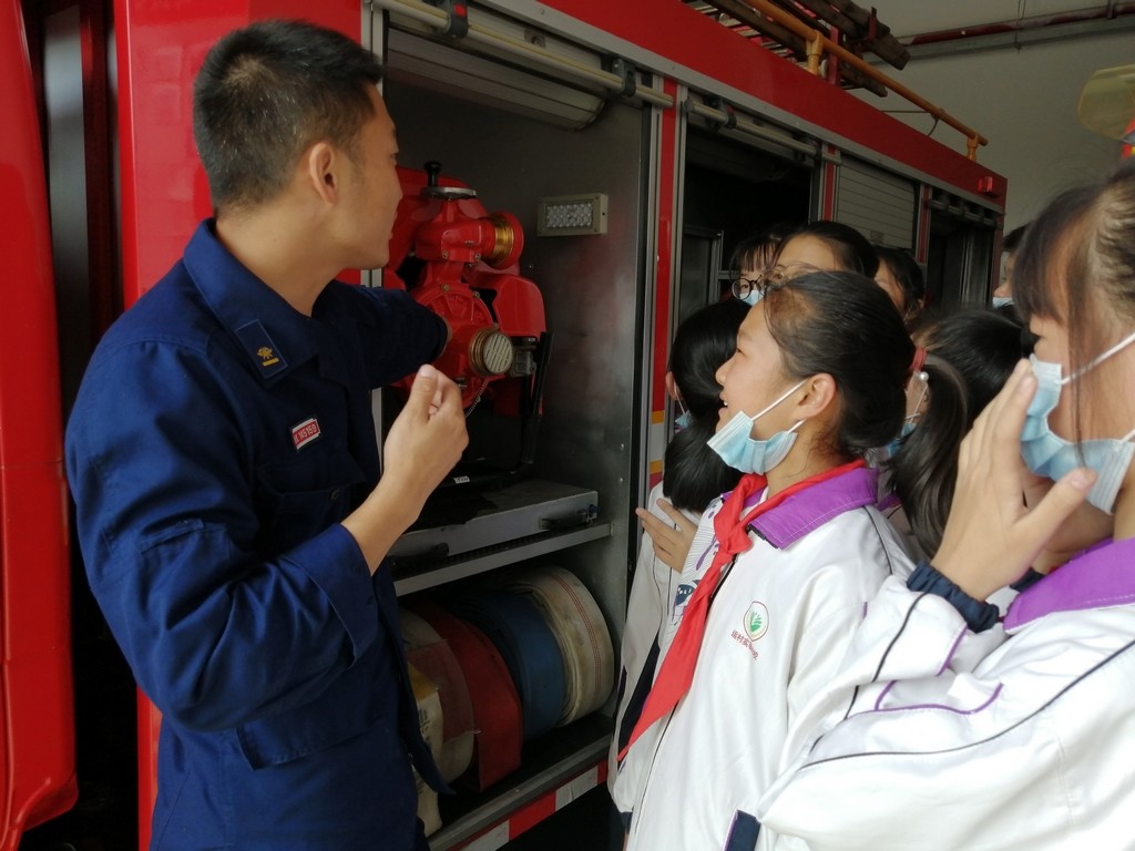 消防安全,永记心中 ——记运村实验学校参观武进高新区消防中队 消防安全关乎着我们的生命,懂得消防知识,学会消防技巧,可以让公共财产和自身利益免受严重的损失。为了让广大学生进一步掌握消防安全知识,增强自救、逃生、自我保护能力,10月14日下午,运村实验学校六(2)班全体学生走进了武进高新区消防中队,与消防员叔叔做了一次“零距离”的亲密接触。 同学们在老师的带领下有序来到消防中队,受到消防队官兵的热烈欢迎。在排列整齐的消防车前,消防中队的中队长向同学们详细介绍了各种消防车辆不同的性能和一些随车器材装备,讲授火灾预防常识以及发生火灾时的注意事项等消防安全知识。围绕着消防车,消防员叔叔还给同学们介绍了消防车上的消防工具,背上压缩空气罐、防烟面具 、PVC密封服等。在中队大门外,同学们还看到了出警回来的消防员如何给消防车注水。 紧接着,消防员叔叔带着同学们上了二楼,去参观内务。整齐摆放的洗漱物品、干净整洁的宿舍床铺、排列整齐的军帽、有棱有角的被褥……同学们被深深折服。这给同学们上了生动的一课,让同学们感受到部队铁的纪律、铁的作风。 最后,同学们还观看了一场触目惊心的消防安全教育片。影片以纪实的风格,直观形象地宣传了火灾的危害及怎样预防火灾,遇到火险时如何灭火,如何保障人身安全及自救逃生等基本消防知识。 消防安全是我们生命安全的重要保障,更是社会和谐的重要条件,消防安全人人有责。这次参观活动,同学们受益匪浅,让同学们把消防安全常驻心中,从我做起,从今天做起,从身边点滴小事做起,携手共同营造安全、祥和的生活环境。