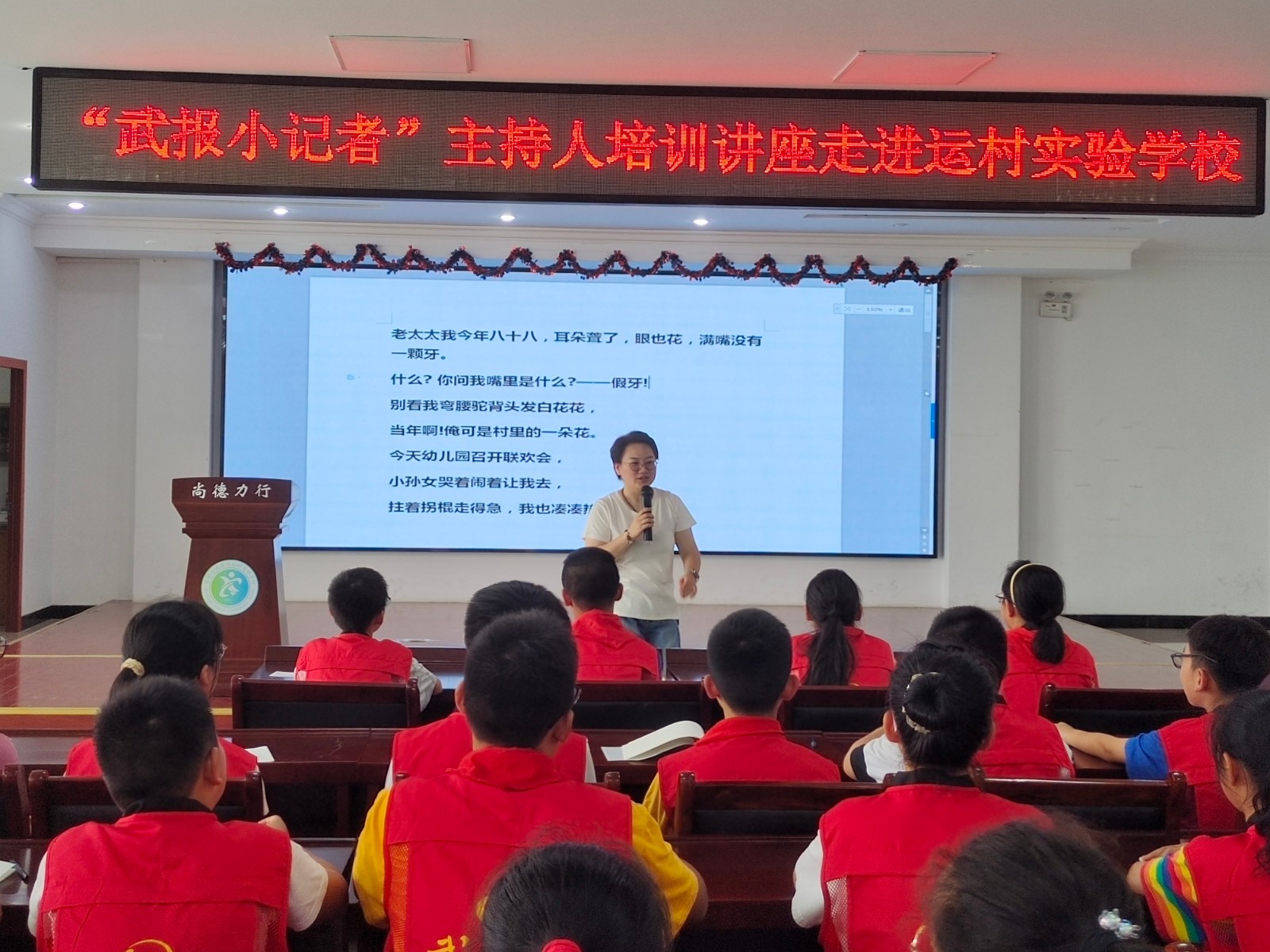 感受声音的魅力 ——“武报小记者”主持人培训讲座走进运村实验学校 6月16日中午,“武报小记者”小主持人培训讲座走进武进区运村实验学校,主持人田清为小记者作了一场以“声音演绎技巧”为主题的专题讲座。 田清是武进区融媒体中心调频FM88.6《快乐早班车》的主持人,连续8年担任“希望之星”全国英语大赛常州赛区集训特聘舞台表演教师,有着13年少儿播音主持教学经验。 活动伊始,田老师从猴子、大象、狐狸三种动物入手,先示范发音,让小记者们感受不同动物的音色音调,接着田老师教授发音技巧,让小记者们学会运用发生技巧模仿三种动物。 接下来,田老师从刚会说话的小朋友到百岁老人声音的不同,启发小记者“亮出”嗓子。在老太太声音模仿秀中,小记者们从台下走到了台上,大胆地进行模仿表演。小记者们认真聆听、学习着,课堂上充满了欢声笑语。 最后,田老师还讲解了主持人站姿,“优美的站姿是人们日常生活中所不断追求的,更是小演员、小主持人所必备的!”田清老师教小记者如何保持正确的站立姿势。 虽然讲座只有短短的一个小时,但小记者们学到了很多主持人方面的专业知识。