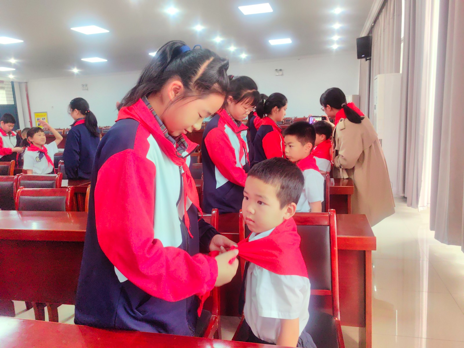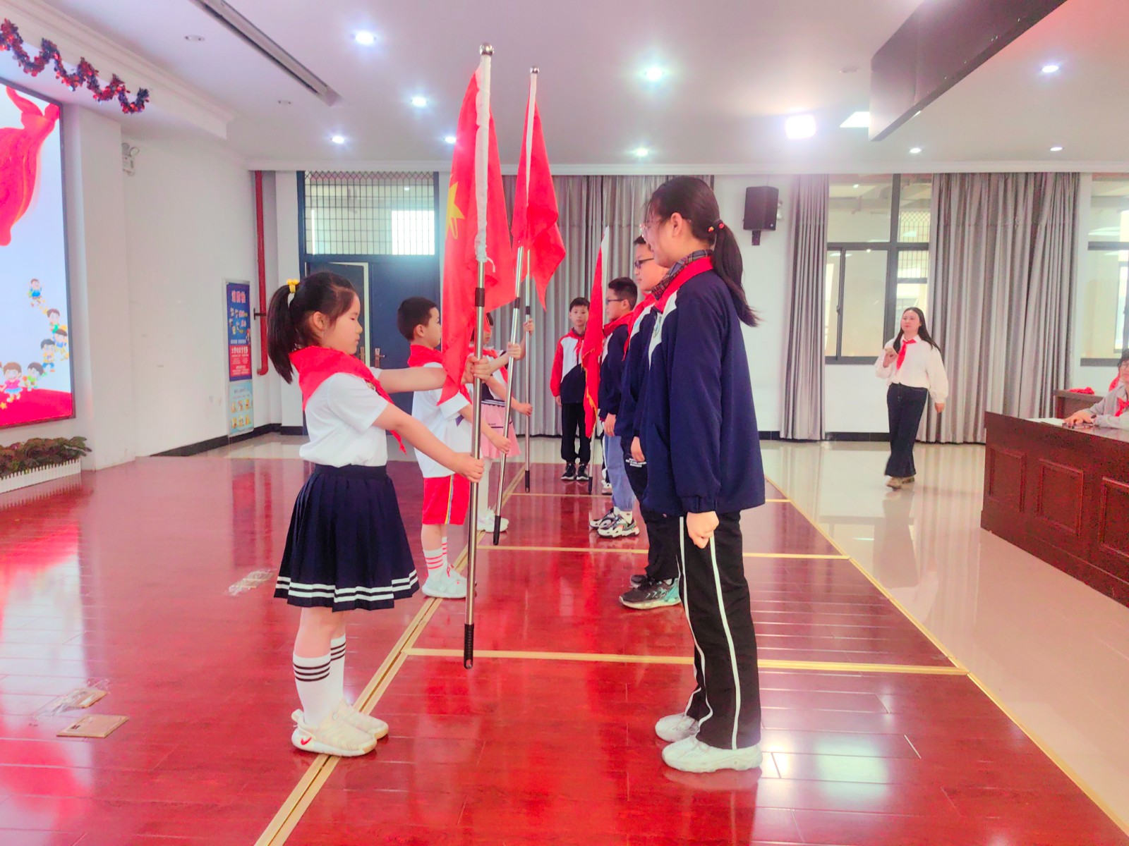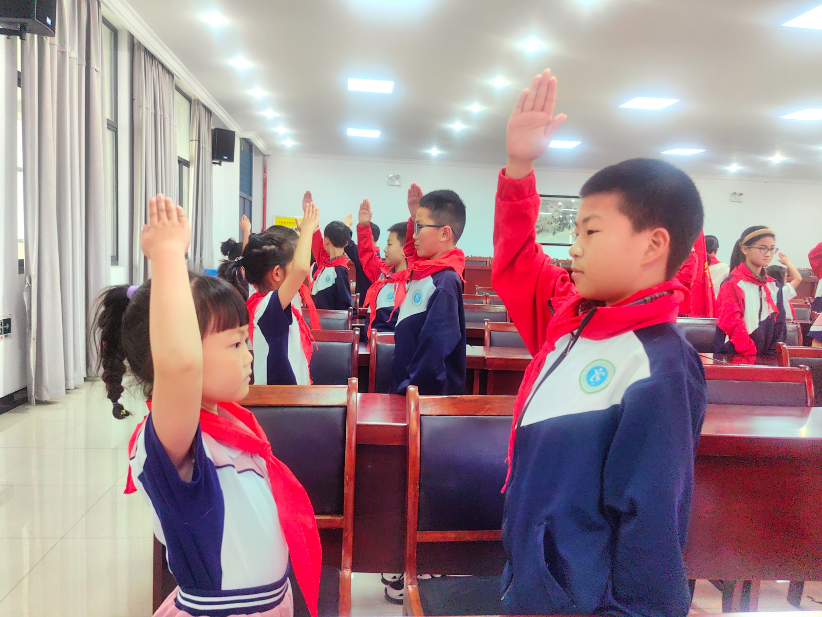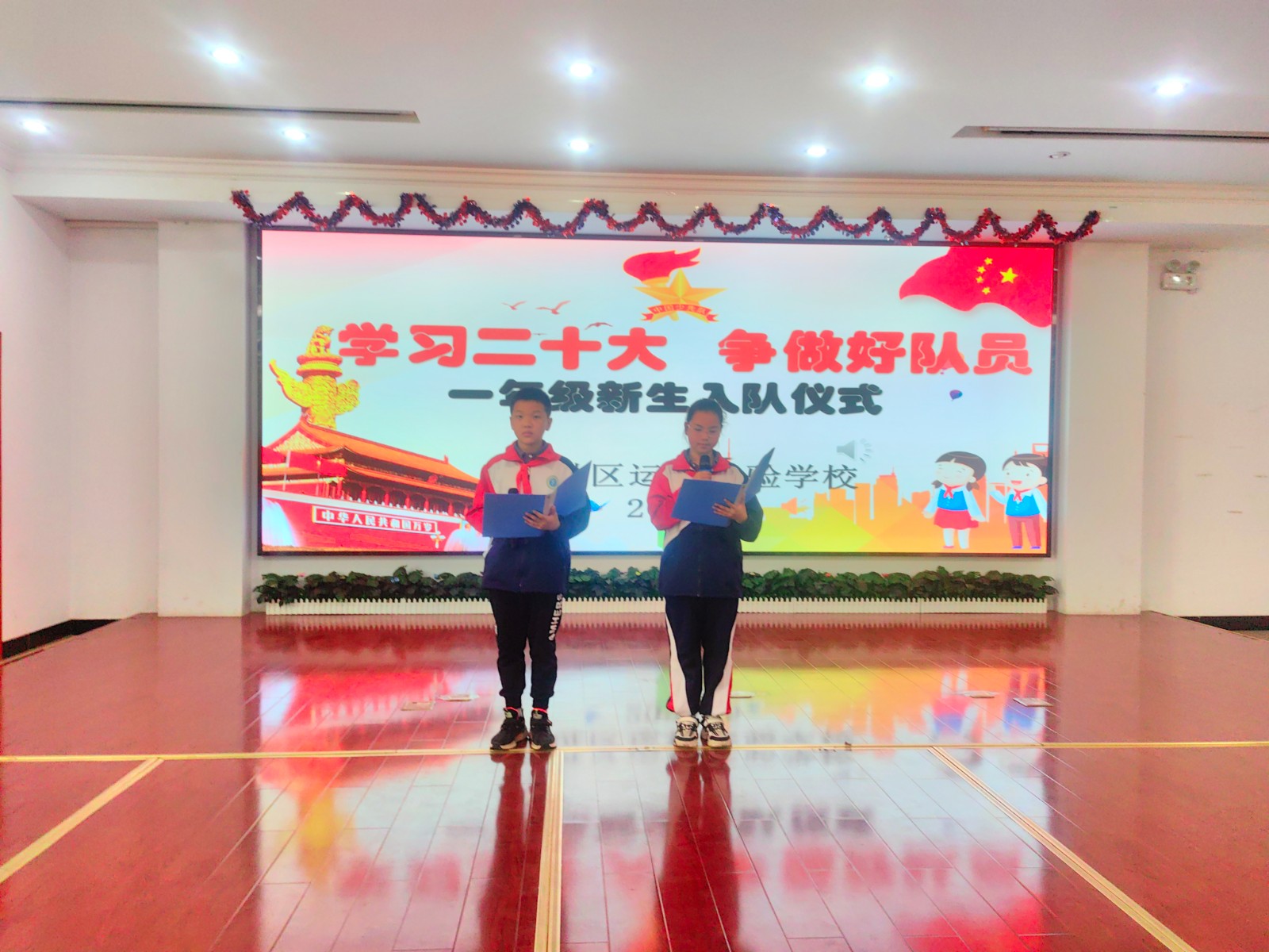 2023年5月24日下午,我校举行了庄严的少先队新队员入队仪式。一年级30位小朋友光荣加入了中国少年先锋队的组织,成为了一名光荣的少先队员! 伴随着节奏鲜明、庄严肃穆的出旗曲,少先队旗手与护旗手们迈着整齐的步伐,雄赳赳、气昂昂地走了过来,拉开了新生入队仪式的帷幕。队员们齐声高唱《中国少年先锋队队歌》,洪亮的歌声表达了对少先队组织的热爱。 运村实验学校德育处薛亚萍主任宣读了“组建一年级少先队组织”的决定,并为三位辅导员颁发聘书。德育处钱燕芬副主任宣读了新队员名单。顾轩宇等30位同学正式加入中队少年先锋队,成为了一名光荣的少先队员。 五1中队的队员们为新队员佩戴鲜艳的红领巾,看着胸前鲜艳的红领巾,新队员们感到无比自豪和骄傲。 30名新队员在大队长顾雪琪同学的带领下庄严宣誓。稚气、铿锵的话语,表达了他们成为一名光荣少先队的自豪心情,也表达了他们努力为红领巾增添光彩的决心。 学校大队委为一年级各中队授上中队旗。 五(1)中队的王梓轩作为老队员发言,给新队员提出了希望。一(3)中队陈智微代表全体新队员发言,决心好好学习,争做新时代好队员。听完了新老队员的心声,敬爱的辅导员恽瑶老师向新队员提出了新的希望和要求,勉励全体少先队员好好学习、好好锻炼、在少先队组织中历练,为胸前的红领巾增添光彩。新队员们还给大家带来了手势舞串烧,来表达成为一名少先队员的光荣与喜悦之情。 入队仪式在队员们的精彩表演中落下帷幕,30名新队员在全体师生的见证下接受了一次庄重、神圣的洗礼。愿队员们在星星火炬队旗的指引下,热爱祖国,热爱学习,不负光荣使命,做优秀的共产主义接班人。