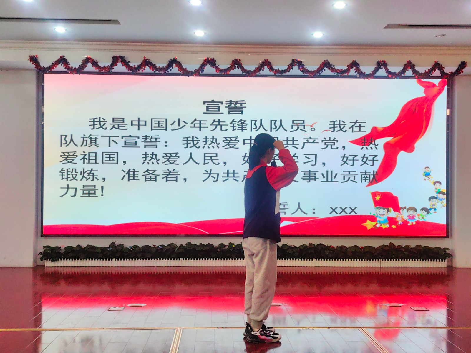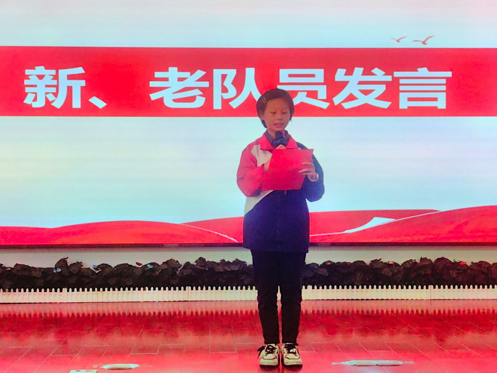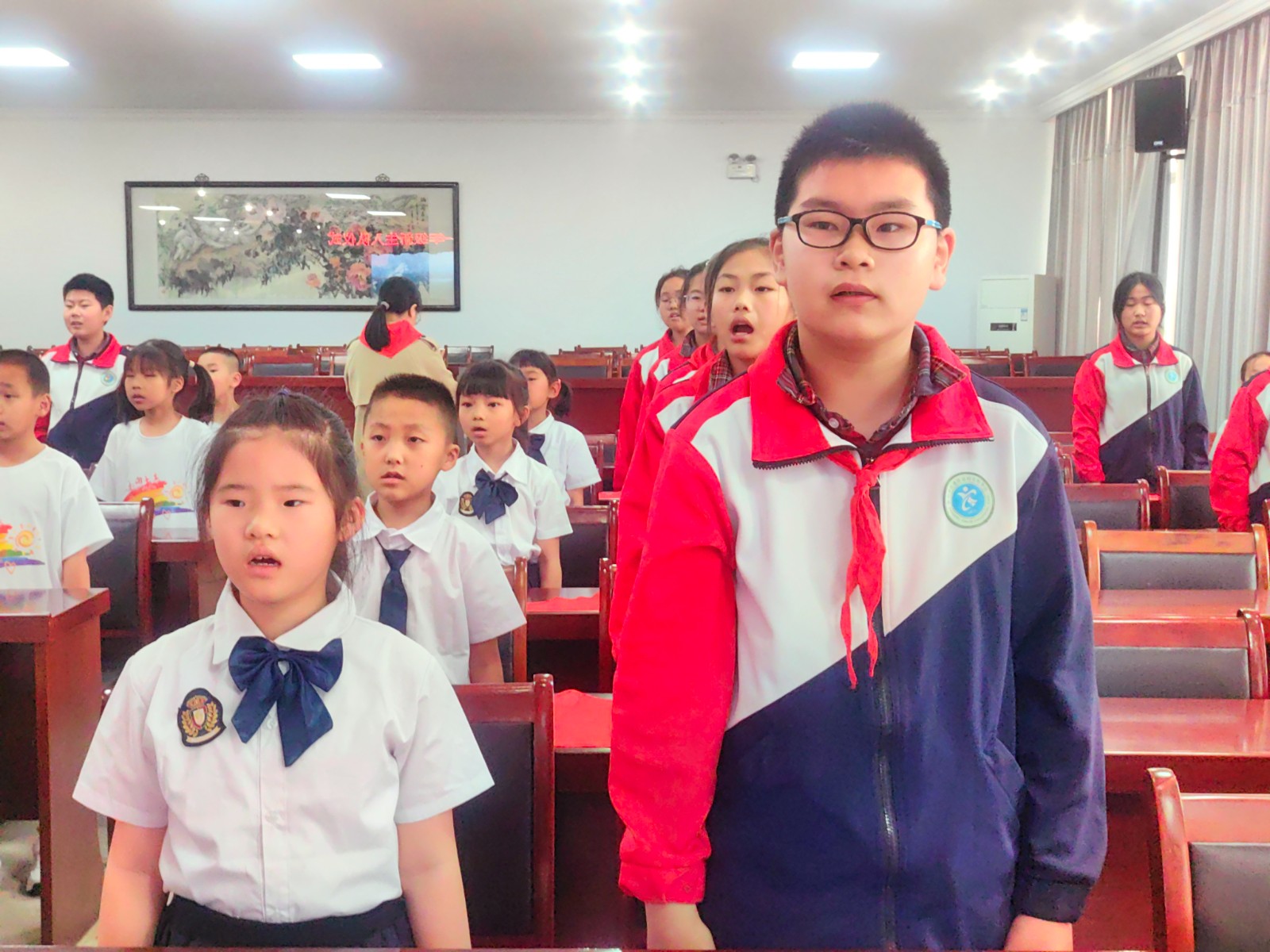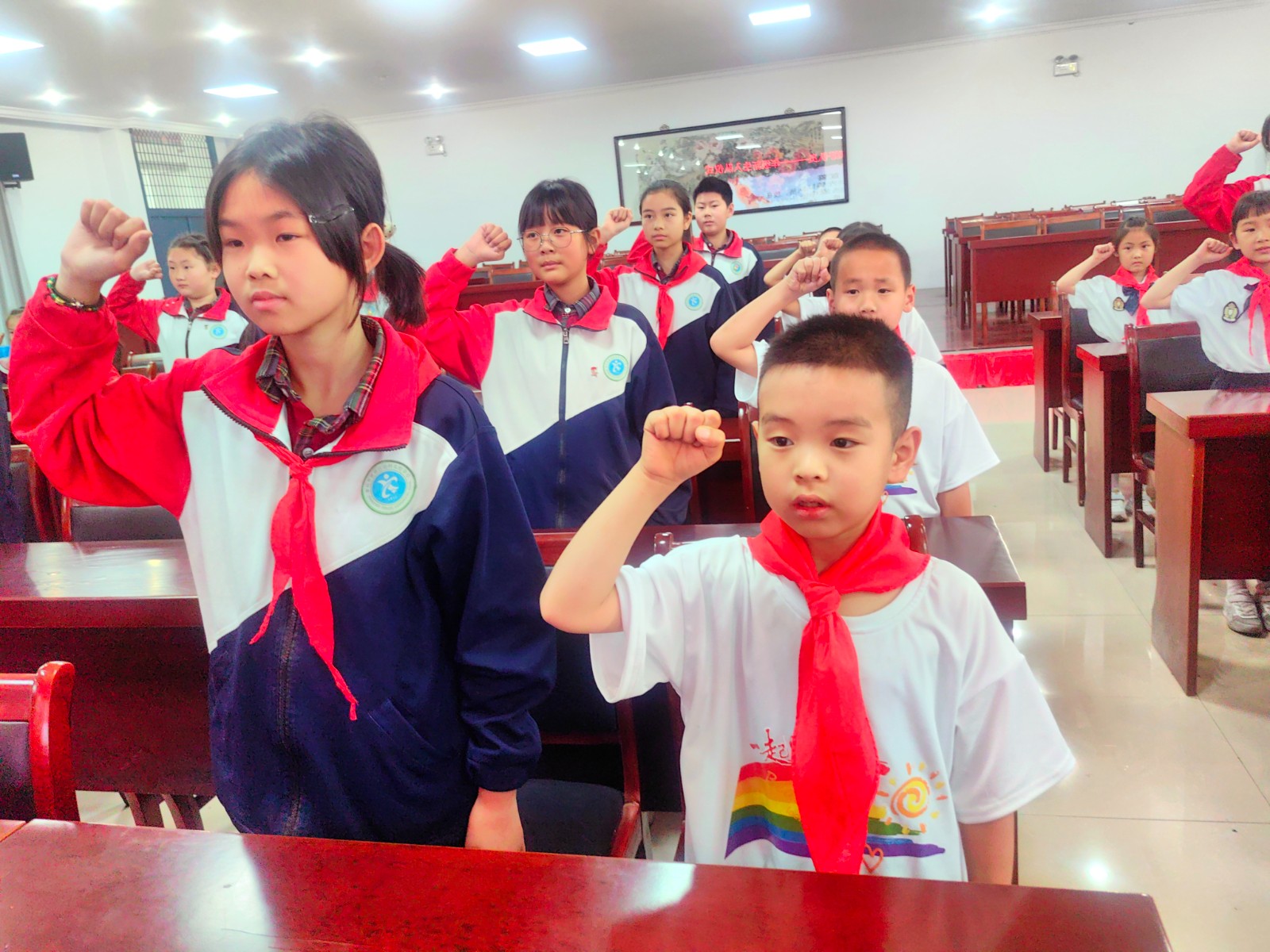 2023年5月24日下午,我校举行了庄严的少先队新队员入队仪式。一年级30位小朋友光荣加入了中国少年先锋队的组织,成为了一名光荣的少先队员! 伴随着节奏鲜明、庄严肃穆的出旗曲,少先队旗手与护旗手们迈着整齐的步伐,雄赳赳、气昂昂地走了过来,拉开了新生入队仪式的帷幕。队员们齐声高唱《中国少年先锋队队歌》,洪亮的歌声表达了对少先队组织的热爱。 运村实验学校德育处薛亚萍主任宣读了“组建一年级少先队组织”的决定,并为三位辅导员颁发聘书。德育处钱燕芬副主任宣读了新队员名单。顾轩宇等30位同学正式加入中队少年先锋队,成为了一名光荣的少先队员。 五1中队的队员们为新队员佩戴鲜艳的红领巾,看着胸前鲜艳的红领巾,新队员们感到无比自豪和骄傲。 30名新队员在大队长顾雪琪同学的带领下庄严宣誓。稚气、铿锵的话语,表达了他们成为一名光荣少先队的自豪心情,也表达了他们努力为红领巾增添光彩的决心。 学校大队委为一年级各中队授上中队旗。 五(1)中队的王梓轩作为老队员发言,给新队员提出了希望。一(3)中队陈智微代表全体新队员发言,决心好好学习,争做新时代好队员。听完了新老队员的心声,敬爱的辅导员恽瑶老师向新队员提出了新的希望和要求,勉励全体少先队员好好学习、好好锻炼、在少先队组织中历练,为胸前的红领巾增添光彩。新队员们还给大家带来了手势舞串烧,来表达成为一名少先队员的光荣与喜悦之情。 入队仪式在队员们的精彩表演中落下帷幕,30名新队员在全体师生的见证下接受了一次庄重、神圣的洗礼。愿队员们在星星火炬队旗的指引下,热爱祖国,热爱学习,不负光荣使命,做优秀的共产主义接班人。