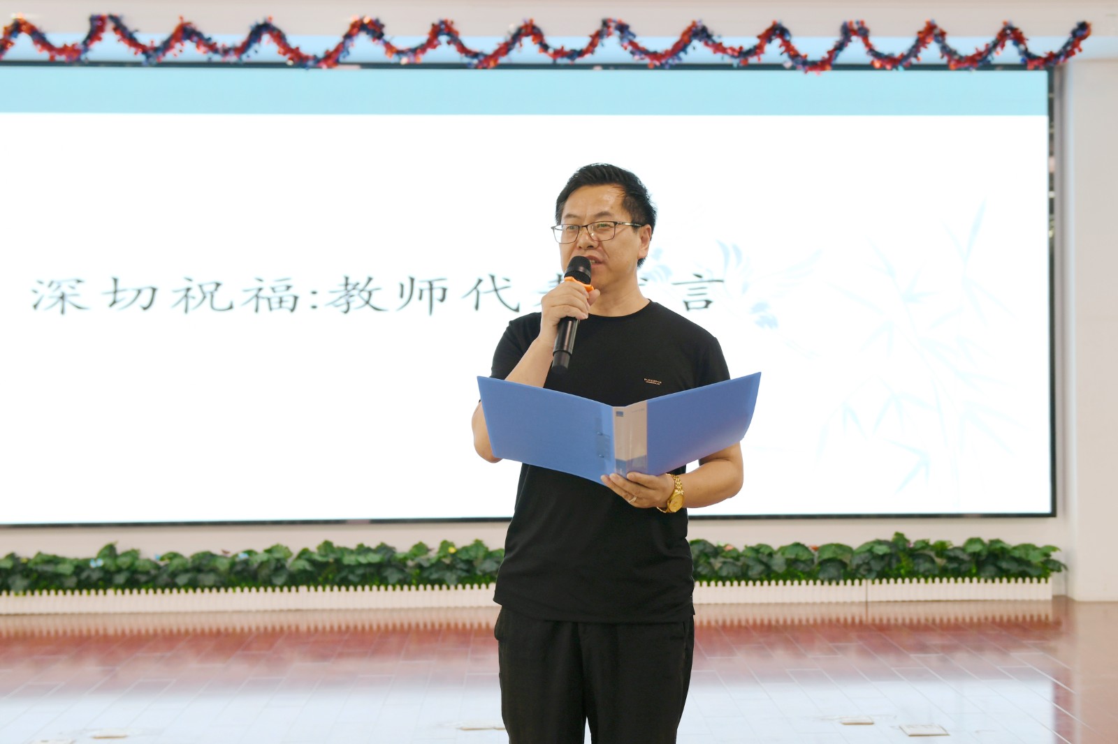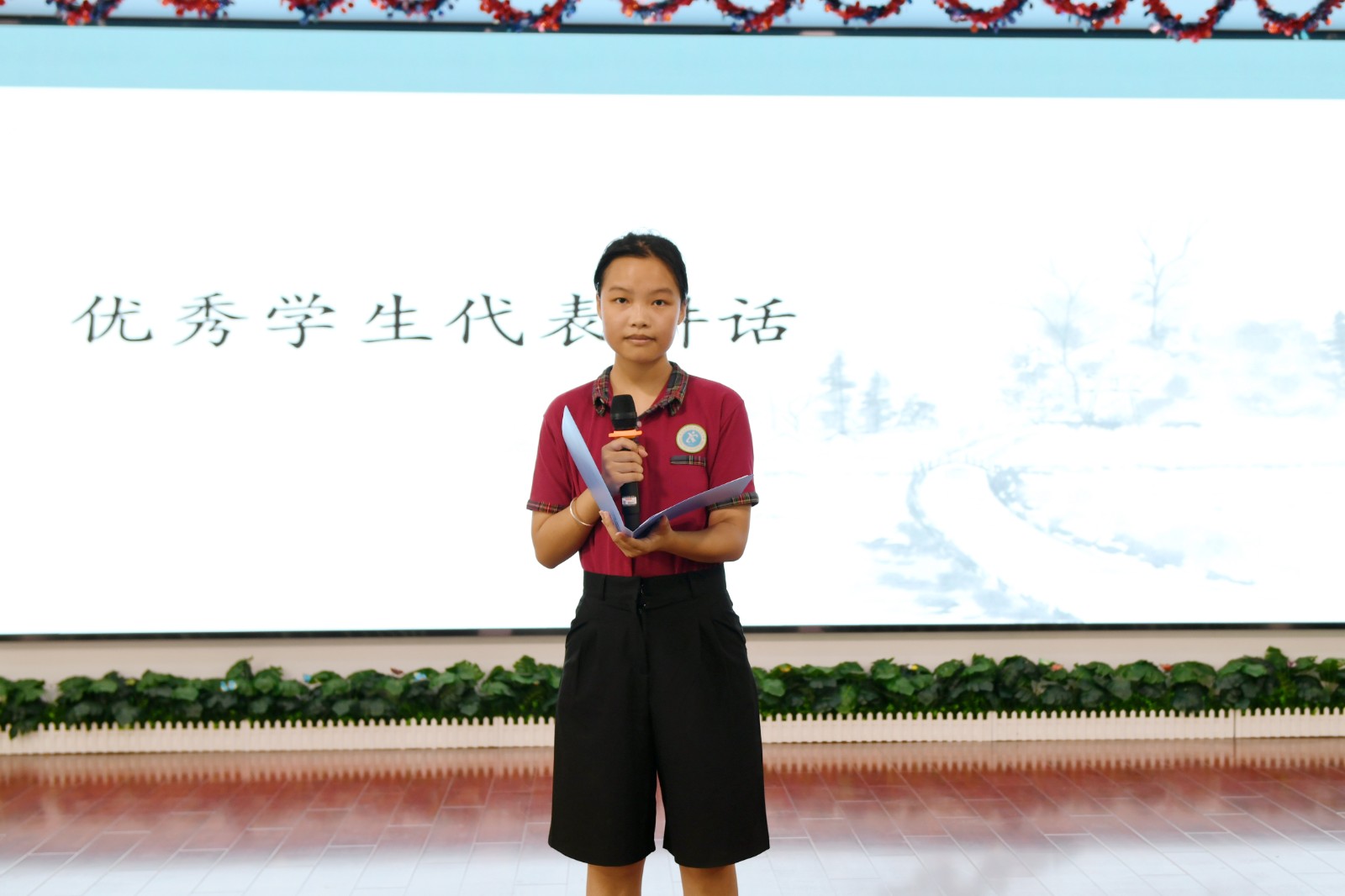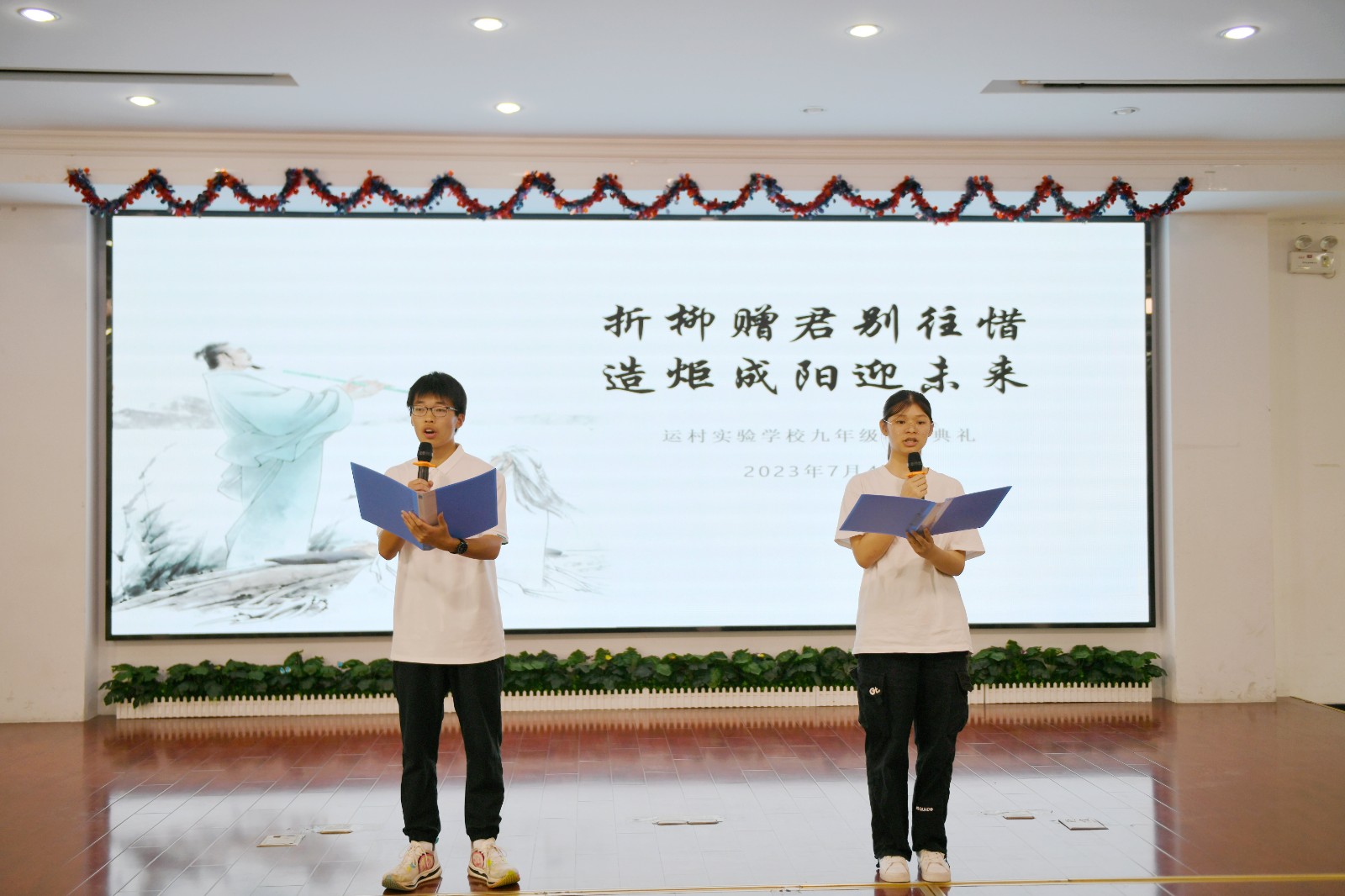 岁月匆匆,时光飞逝,又是一轮三年,又是一季盛夏,又是一度毕业季。7月4日下午,在这充满生机的日子里,运村实验学校全体九年级毕业生于力行楼四楼报告厅举行了隆重的毕业典礼。运村实验学校校长董皓,副校长薛宏林,德育处薛亚萍主任及全体初三师生参加了本次毕业典礼。本次毕业典礼由张一洁和邓思雨两位同学主持。 在主持人深情的话语声中,毕业典礼拉开了帷幕,同学们热烈的掌声洋溢着欢喜与期待。 薛宏林副校长发表了讲话,赞扬了三年来运实全体师生的共同努力,寄予了对同学们的殷切希望,表达了真挚美好的祝福,在座所有师生都露出了真诚快乐的笑容。 优秀学生代表金晶同学慷慨激扬的发言,道出了对母校和老师的感激感恩,对同学的离愁别绪,更彰显了运村实验学校学子积极向上的风采! 教师代表王建国以热情奔放的开场白调动起全场师生的激情,用最质朴热烈的语言回忆了三年来的师生生活和拼搏的求学经历,最后所有的祝福都融进了"五千万"之中:千万要健康,千万要快乐,千万要自信,千万要拼搏,千万要成长。 接着进入了献花环节,三个班级的班长手捧鲜花,整齐列队,将全体同学的感激融入了鲜花之中,献给了可敬可爱的班主任老师。牵一抹阳光偕行,赠一缕春风渡人。感恩我们的班主任,因为有你,才成就了今天的我们。三年前,我们相遇在这里,就像春遇见了冬,有了岁月;天遇见了地,有了永恒;你遇见了我们,便有了爱的教育诗篇。 三年的苦读,三年的探索,三年的拼搏,成长了师生,成长了运实。这三年激扬的青春,是奋辑笃行,臻于至善,是勠力同心,和衷共济,是踵事增华,踔厉奋发。正所谓"少年当有凌云志,万里长空竞风流。"三个班级的精彩节目,生动展现了同学们昂扬向上的精神风貌。 九(1)班《少年》 九(2)班《起风了》 九(3)班《灰色轨迹》 毕业典礼的最后一个环节,由董皓校长颁发毕业证书,祝贺大家毕业了。 随后,在主持人高昂的语调中,在同学们不舍的目光中,毕业典礼落下了帷幕。 折柳赠君,是临别的意境,几多不舍,几多伤感,几多忧愁。但同学们的青春永远是热烈的,向上的,祝愿所有的同学前程似锦,云程发轫,干霄凌云,葳蕤蓬勃,延彼遐龄,祝贺2023届初三学子顺利毕业! 撰稿:张一洁 摄制:徐 辉 审核:校长室